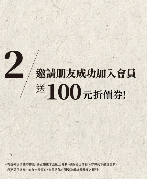 2. 會員推薦計劃:歡迎您邀請新會員加入,每成功邀請一位新會員,現有會員可獲得100元購物抵用券,新會員則可獲得首次100元折價券。(滿500可使用)